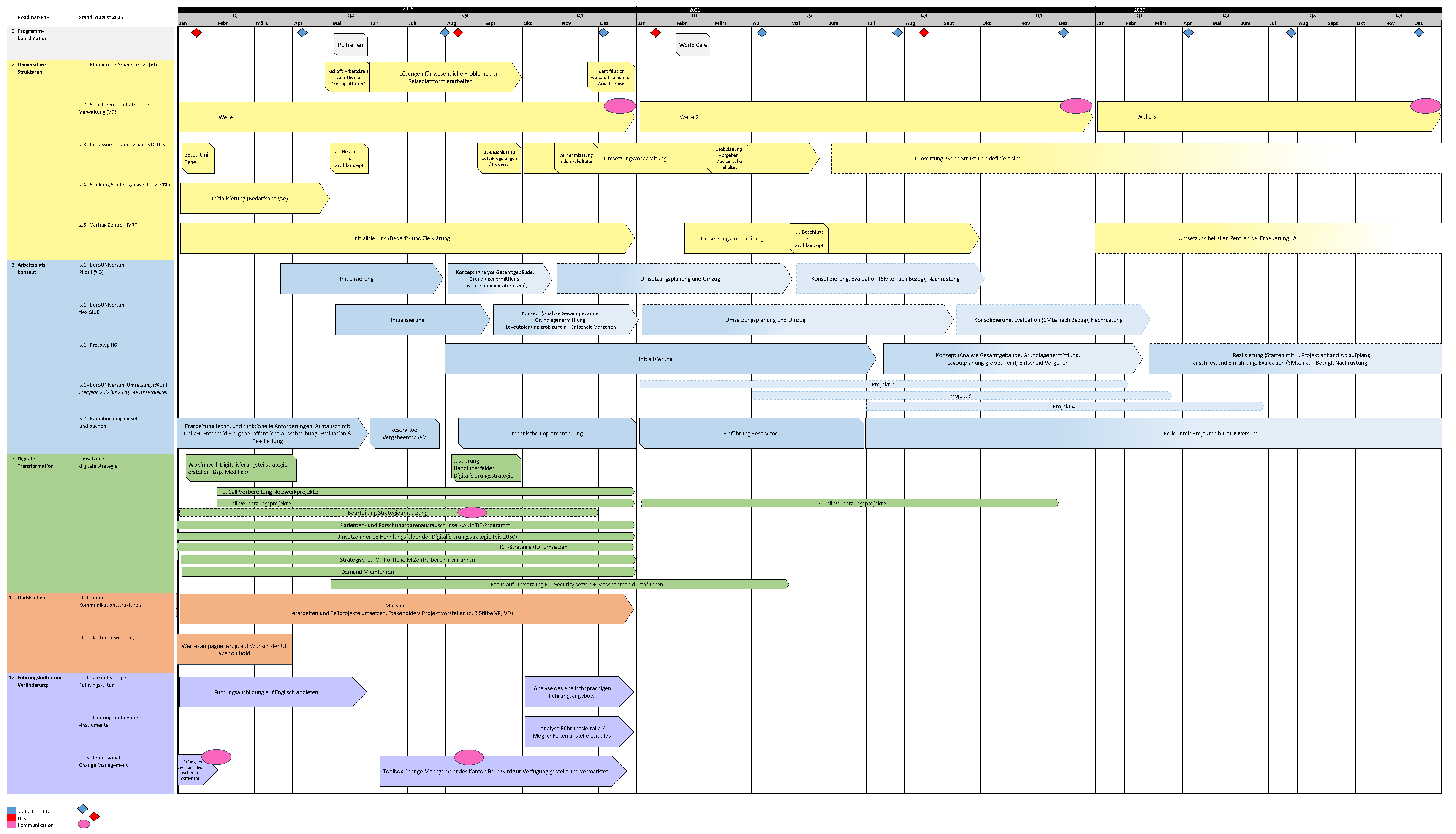 To find answers to this question, employees of the University from all faculties and the central administration, together with external partners from politics, business, and science, went on a three-day retreat in June 2022. From the results of this retreat, twelve action areas emerged that were subsequently worked on by project teams. In autumn 2024, Fit for Future was redimensioned by removing action areas from the program, whose projects have been completed or are well advanced. Since then, 5 of the 12 action areas continue to run under the Fit for Future umbrella.